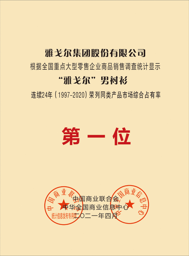 2021年:雅戈爾男西裝連續(xù)21年榮列同類產(chǎn)品市場綜合占有率第一位